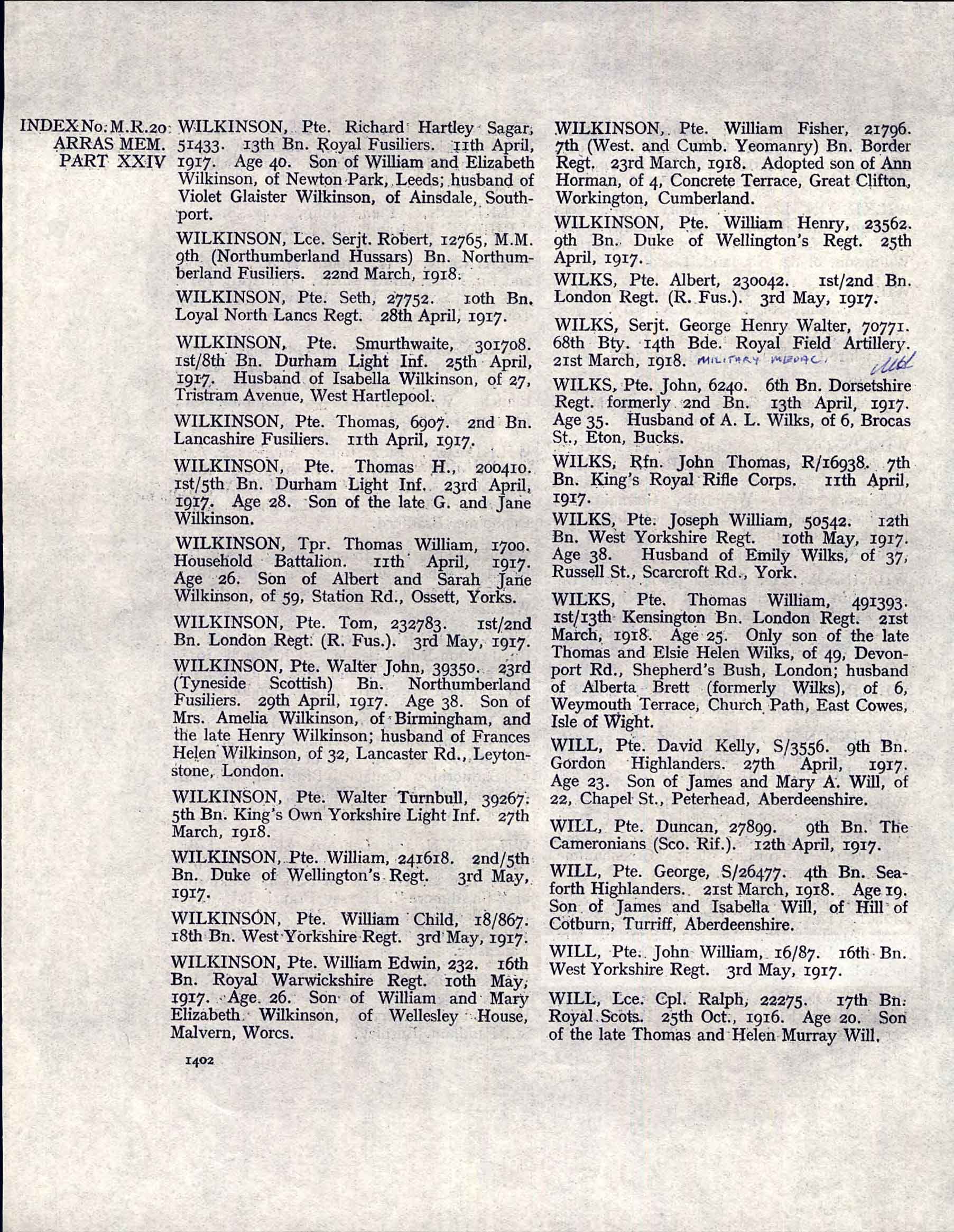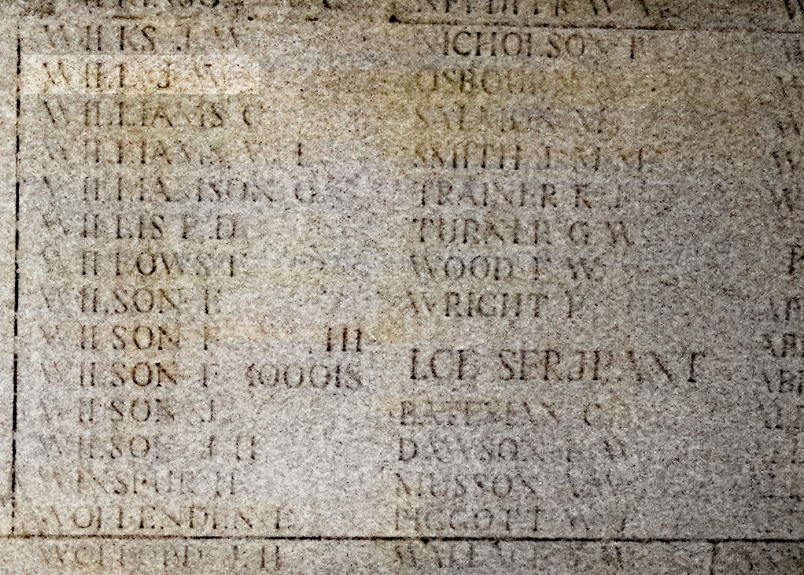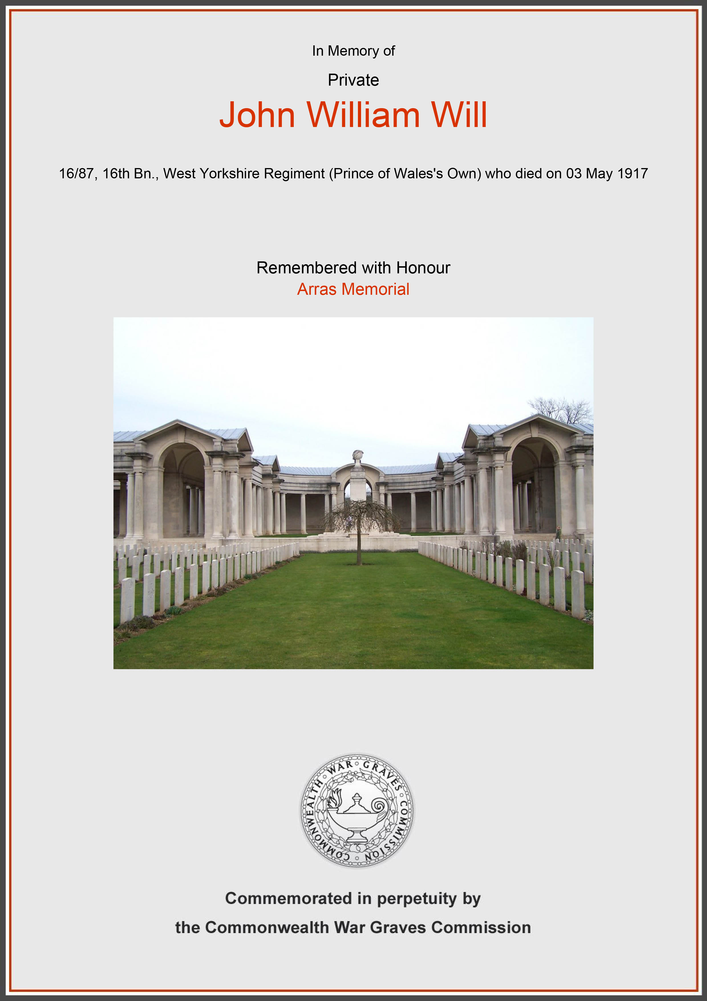 Private J W Will is commemorated on the Arras Memorial in the centre of Arras near the Citadel.