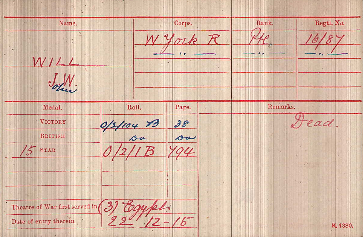 Private John Will’s army number was 16/87, an indication, perhaps, that he was