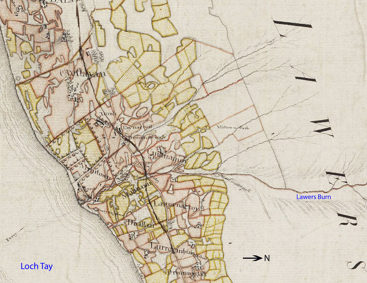The surveyors working for the Farquarson Survey of 1769 observed that, "…the bank on both sides of the [Lawers]